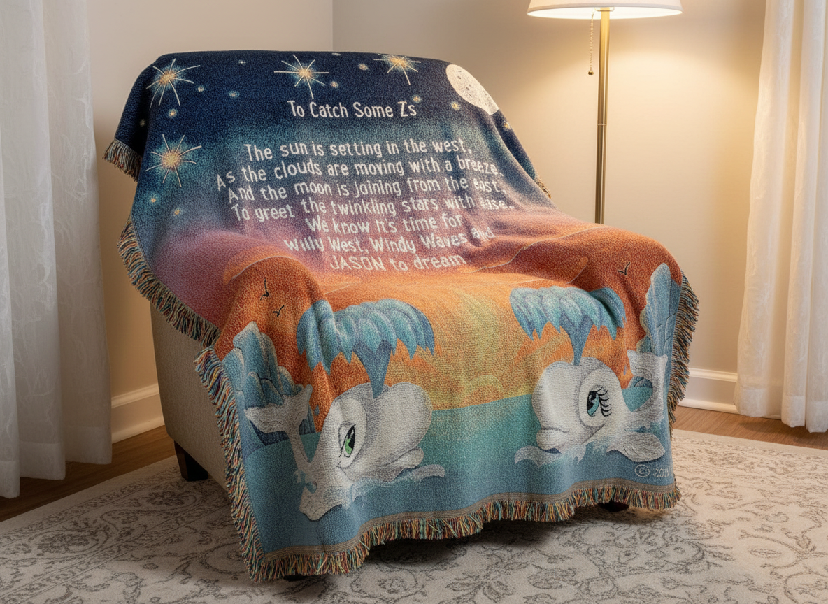 Partnering with Wovenart.net, Virginia transformed her artwork into woven, personalized throw blankets. During this phase, she also created a new poem that deepened the story of the Whales.